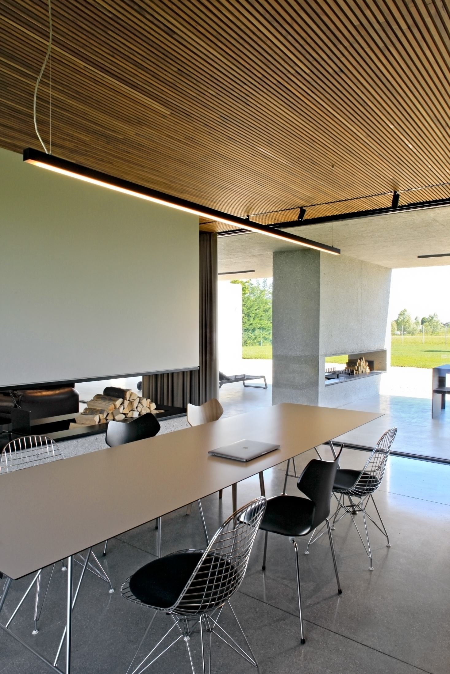 The layout of the house allows the indoor areas to communicate directly with the outdoor ones, expanding the space both physically, through the porch, and visually, through the large glass doors.