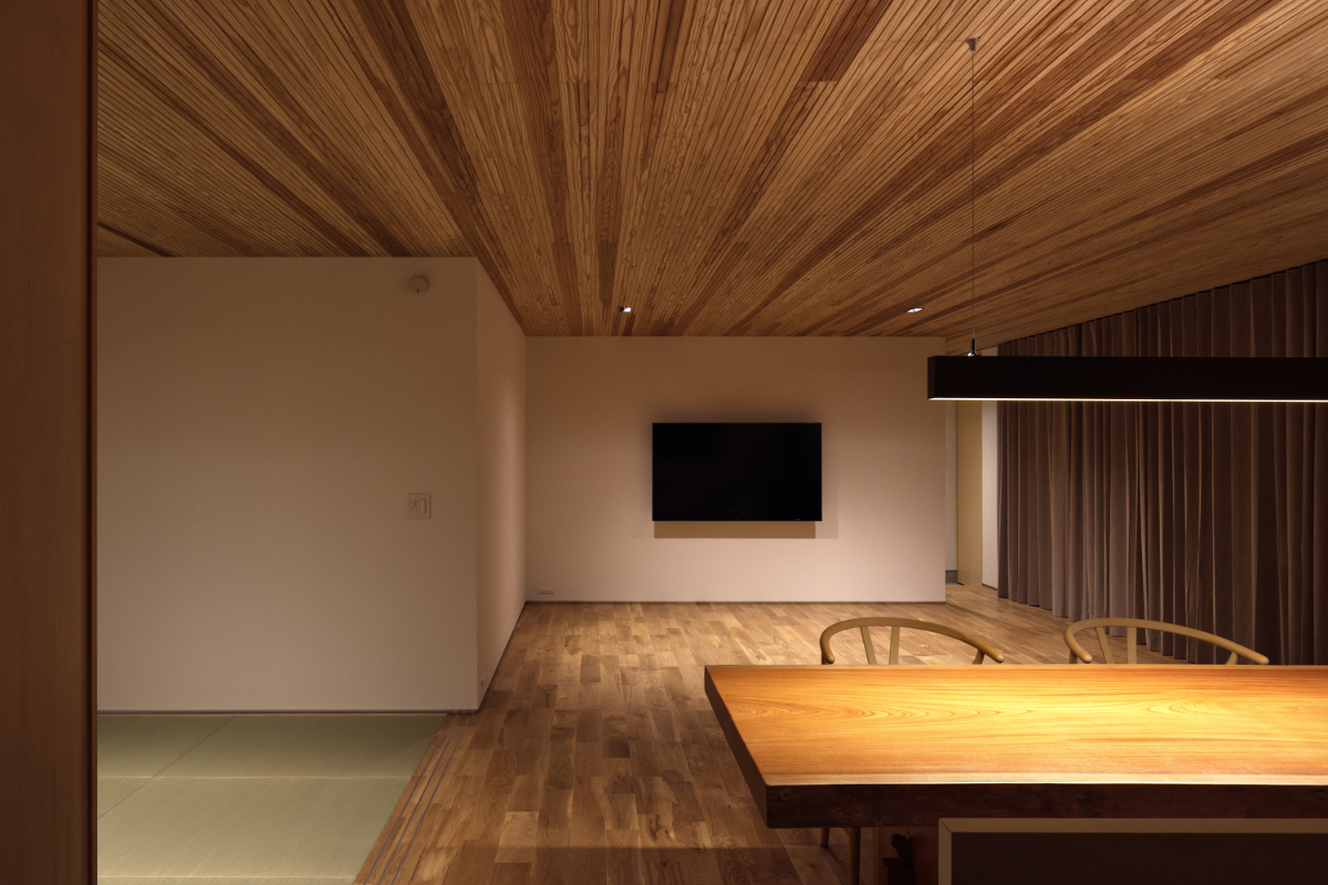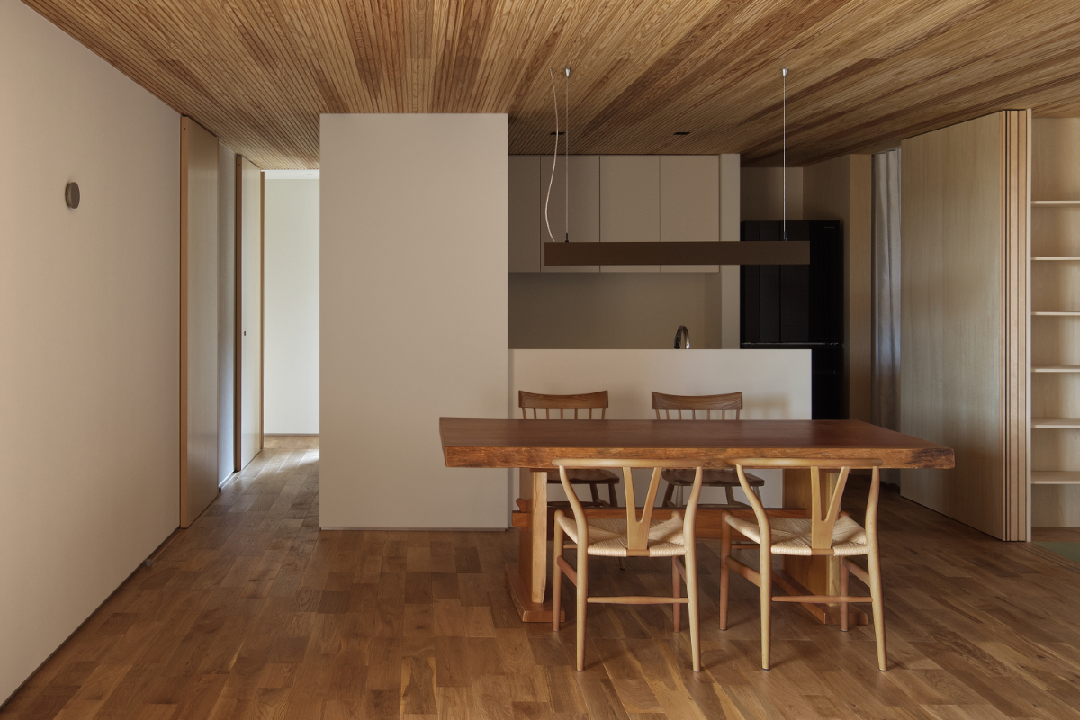 Inside, the living/dining/kitchen area, which is a place for family gatherings, is placed in the center, and by making it into one space including the adjacent Japanese-style room, we ensured that the area is as large as possible. In addition, by unifying the ceiling height of each room and not installing descending walls along the traffic lines, we created a plan that ensures an uninterrupted continuity between the inside and outside.
