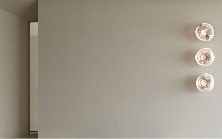 The first of the private environment is a large dressing room inspired by the atmosphere of Berlin's avant-garde boutiques. Exhibited as in a window, the outfit steals the spotlight in the mise-en-scène, surrounded by retro-inspired display cabinets and futuristic furnishings. The master bedroom has a monastic essentiality. It is a shelter and an alcove. With its essential and geometric design inspired by the Japanese aesthetics, the bed is the heart of the space. A work, realized by the Informal Italian artist Alberto Burri in the second post-war period, oversees the most intimate area of the house. In a curious creative game based on contrasts, the rational image of the bed acts as a counterpoint with the marble sink that introduces to the en-suite bathroom, a material and hyper-expressive object, extracted "per levare" from a block of rough stone. A domestic vision that draws on a museum concept through the search for asymmetries, through the balance between full and empty and the contrast between reflections and transparencies.