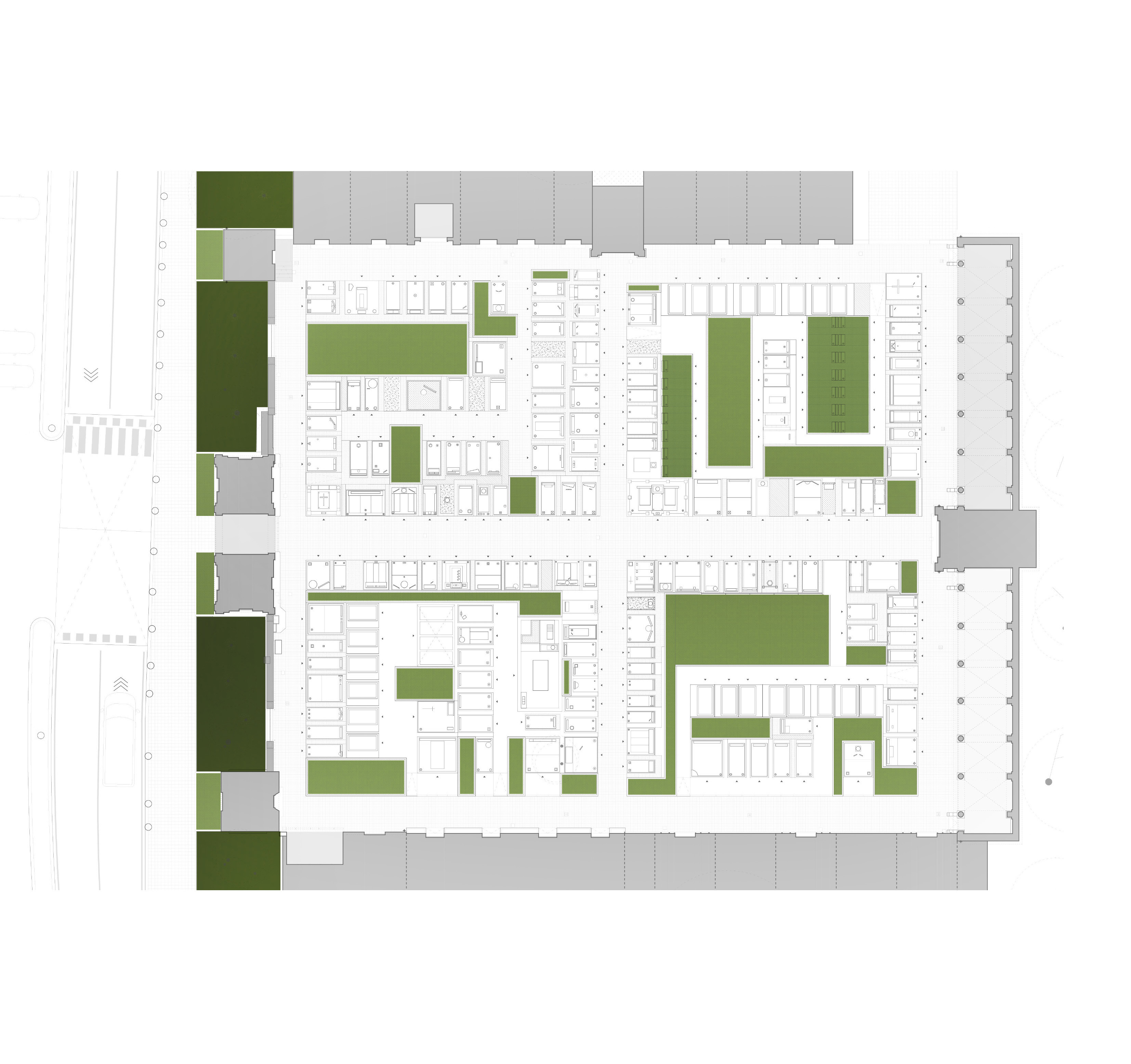 A system of green infiltrations, similar to "vegetal joints", inserted wherever possible according to a mosaic scheme, draws a particle cloud of new vegetal presences with the aim of increasing the environmental, atmospheric and visual quality of the worship space, now completely mineralized and without any vegetation intervention.