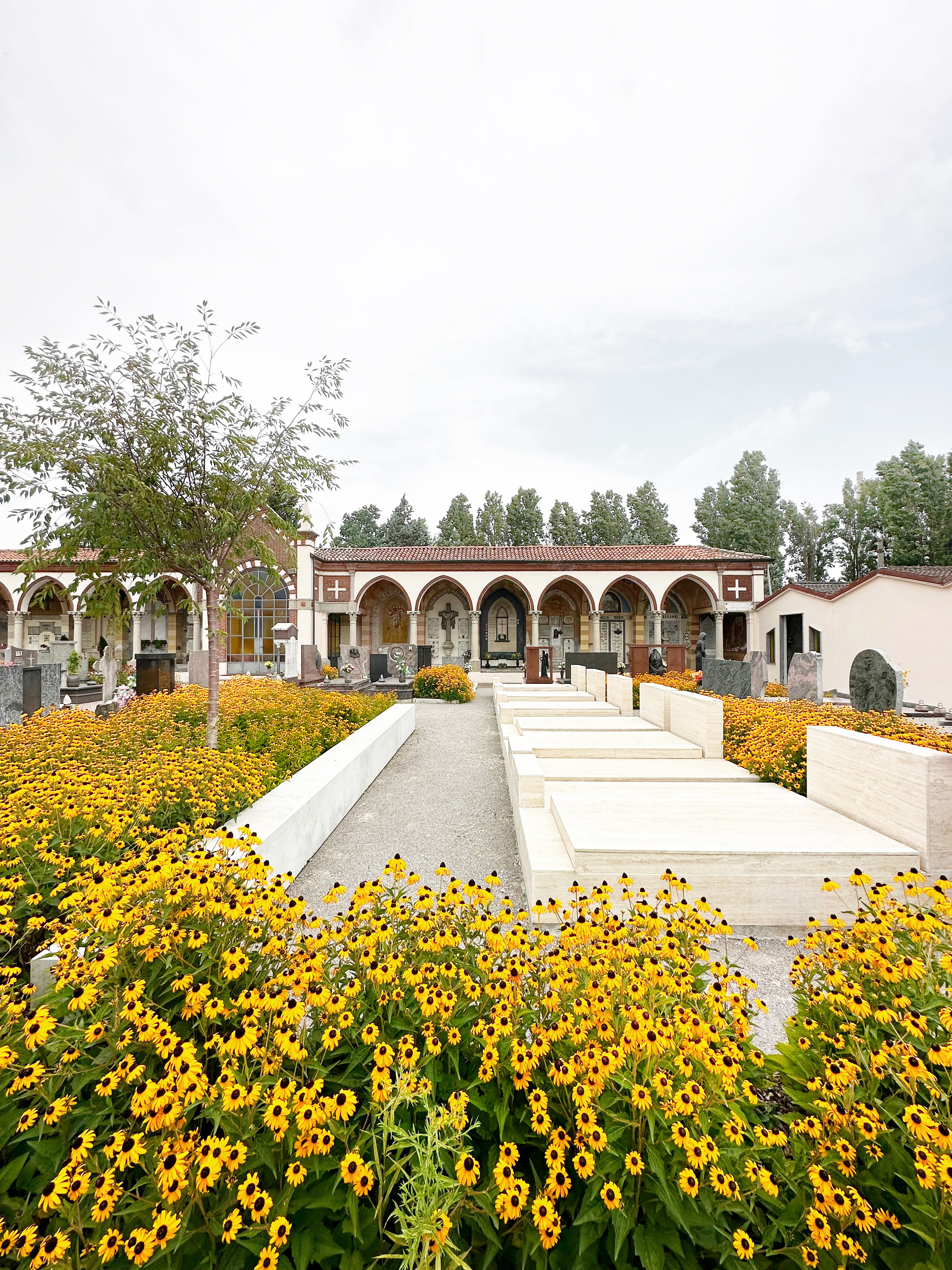 The new underground family tombs are designed in the appearance of large petrified beds, covered with natural travertine with warm colors and soft surfaces. The tombs are as if they were lying on the ground, almost simply placed on the surface of this large garden in which colors and scents now reign.