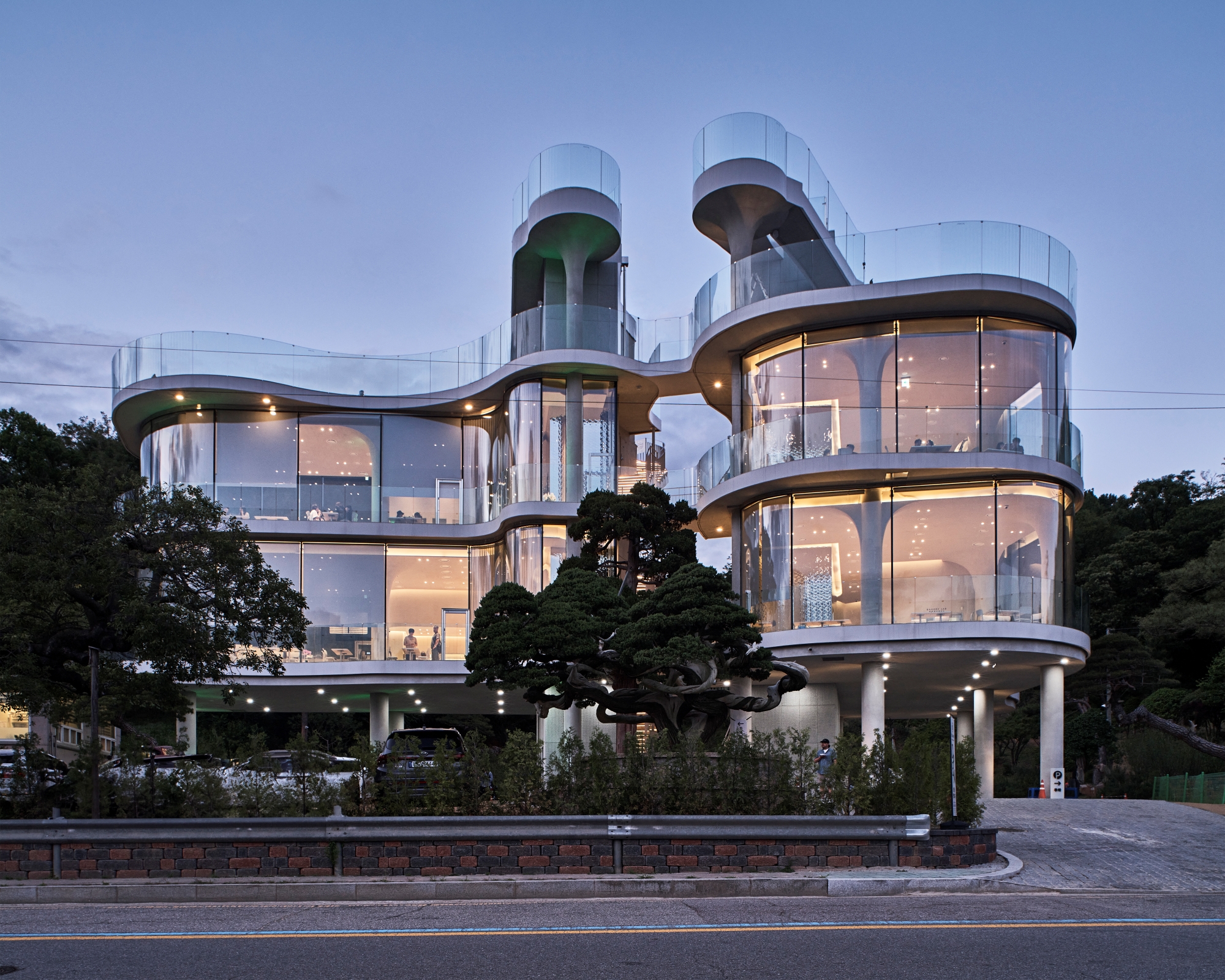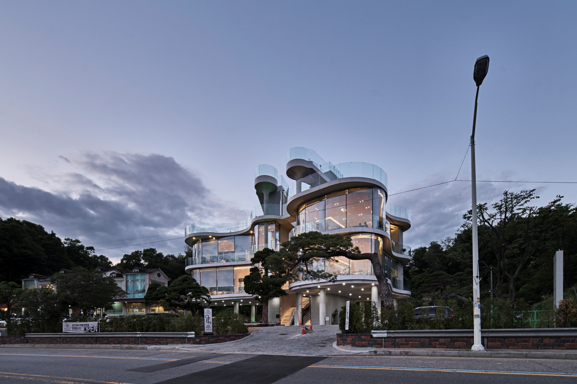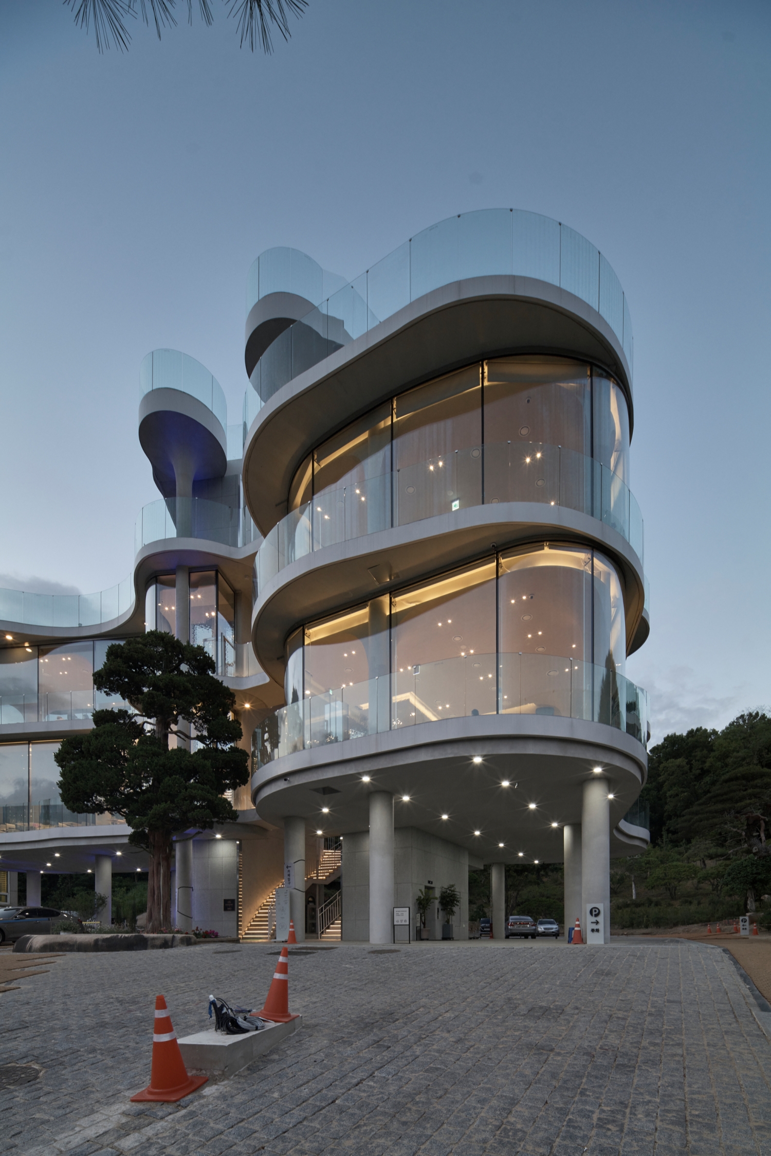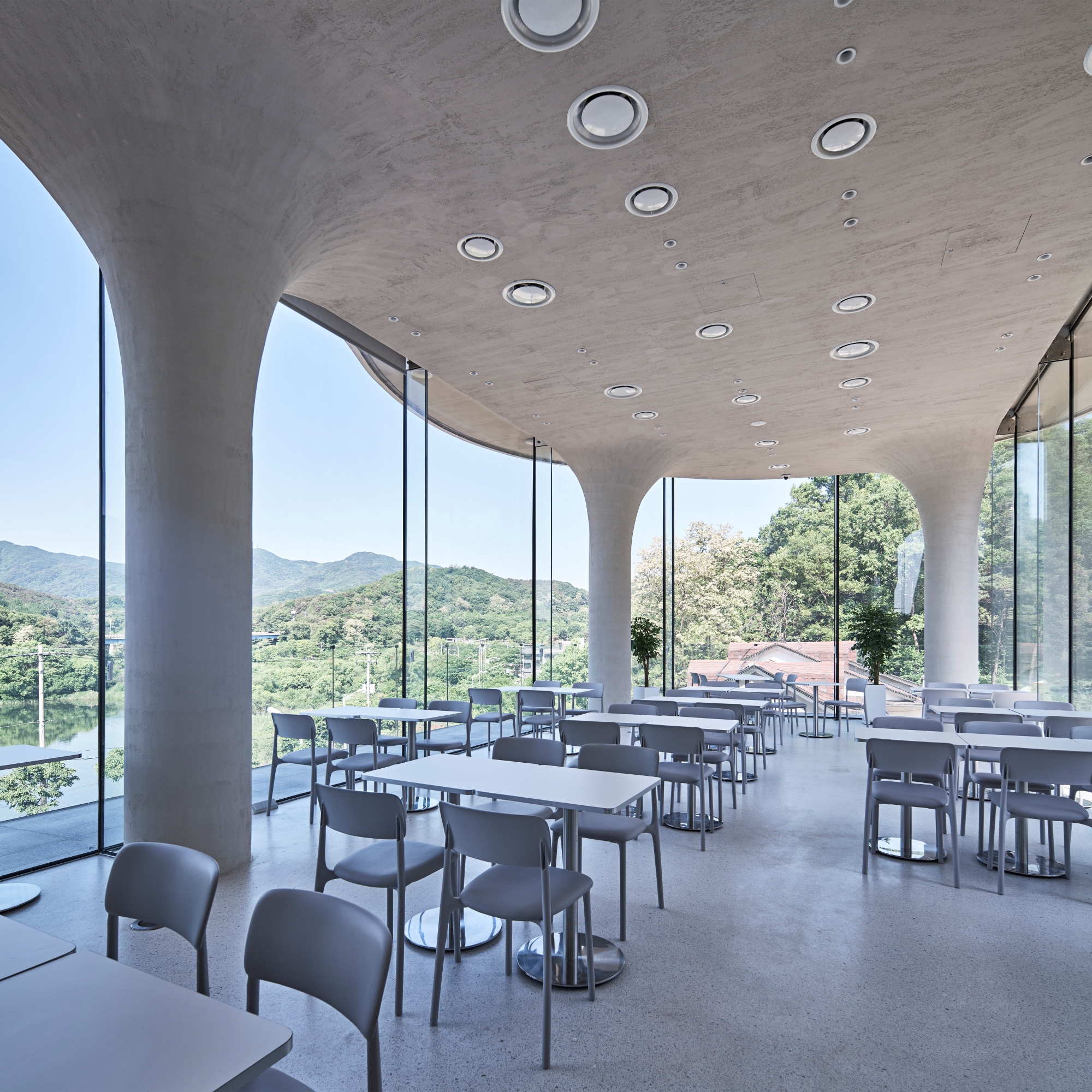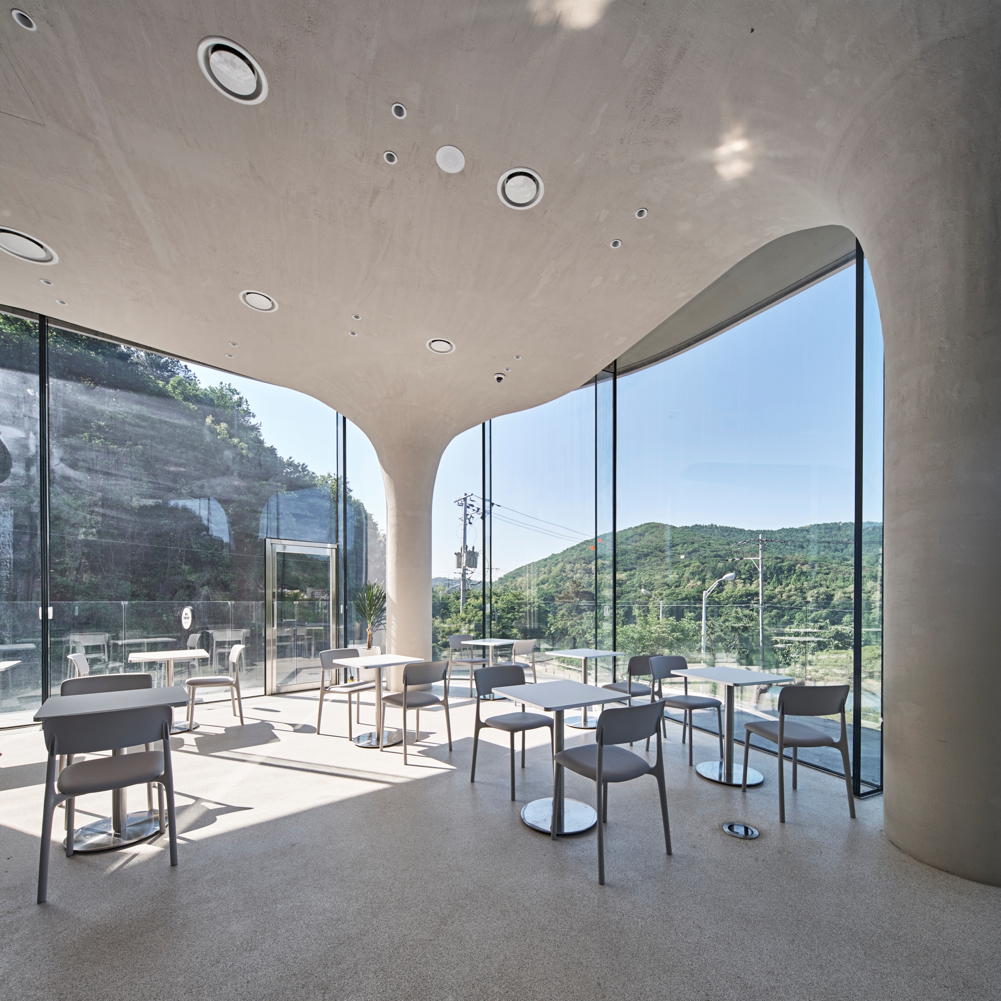 Each space was planned to be as exposed as possible to the view of Daewang Reservoir in front of the building and the forest of Inreungsan Mountain in the back. In order to maximize the space's intrusion into the nature of the front and back, the size of the surface facing the view was maximized through the curve of the façade, and the space was created to create a spatial effect like a pavilion that naturally intrudes into nature. The view frames of the secondary view formed in this way are structured in the form of a curved ceiling that matches the exterior of the building and a pillar with the ceiling flowing down. It is a curved surface on the elevation along with a curve on the plane, and is a curved surface without changes in interior and exterior materials. A single internal space shape was created.