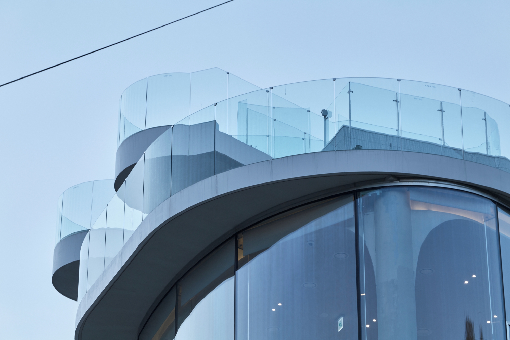 The exterior of Cafe Rosemary is an extension of the interior space, with three layers of curved balconies stacked on top of each other. It is a feature of the site located between nature, where the architectural context of the city is not connected, and the curved Daewang Reservoir and the sky of Cheonggyesan Mountain and Inreungsan Mountain. Between the lines created by the lines, we attempted to adapt them to the land context by borrowing the crystal glass curtain wall that reflects the transparent characteristics of water and the motif of layered fog clouds over the mountains.